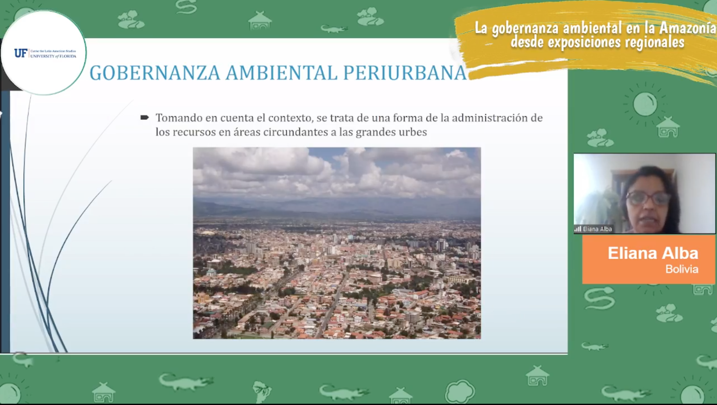 La boliviana Eliana Alba expuso alrededor de la “Gobernanza ambiental en zonas periurbanas”, planteó la importancia de pensar la administración de recursos en las urbes para evitar la segregación por una falta de ordenamiento territorial, una falta de sistemas de saneamiento y un buen manejo de residuos, aspectos que inciden en la vida de las familias que viven en zonas periurbanas de Cochabamba.