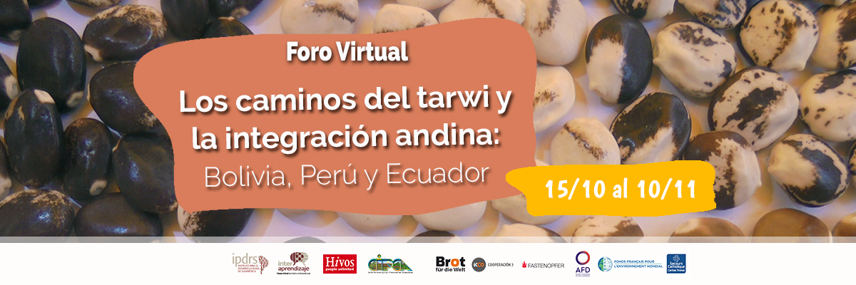 “Los caminos del tarwi y la integración andina: Bolivia, Perú y Ecuador”, es un foro virtual para aproximarnos a la protección, procesamiento, comercialización, consumo y protección genética del tarwi o chocho, leguminosa que integra a los países andinos de Bolivia, Perú y Ecuador. Los foros virtuales son un espacio de actualización de conocimientos, articulación e intercambios entre profesionales, técnicos, productores, estudiantes y personas interesadas, que quieren profundizar e investigar temas de desarrollo rural.