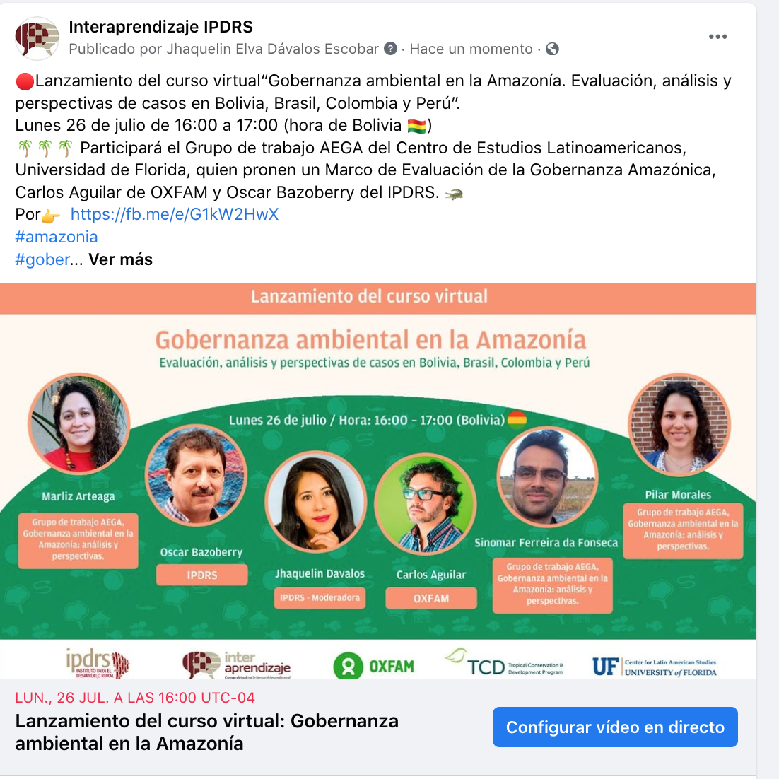 El Curso virtual. Gobernanza ambiental en la Amazonía. Evaluación, análisis y perspectivas de casos en Bolivia, Brasil, Colombia y Perú, desarrollado del 26 de julio al 1 de octubre de 2021. Este curso fue propuesto por el Grupo El Grupo de Trabajo “Evaluando la gobernanza ambiental en la Amazonía” (AEGA), con el apoyo del Programa de Conservación y Desarrollo Tropical (TCD) de la Universidad de Florida, OXFAM y el Instituto para el Desarrollo Rural de Sudamérica.
