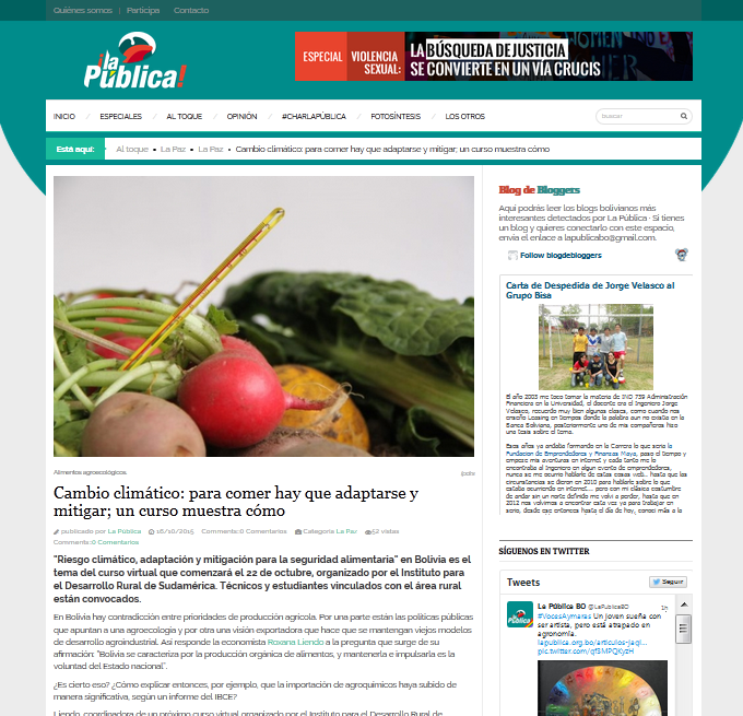 La Pública, una plataforma digital que busca fortalecer el ejercicio ciudadano y la construcción de espacios públicos más activos y plurales a través de la articulación del periodismo, las nuevas tecnologías y el activismo en todas sus formas, destacó mediante un artículo en su sitio web el Curso virtual Bolivia: Riesgo climático, adaptación y mitigación para la seguridad alimentaria promovido por el Instituto Para el Desarrollo Rural de Sudamérica (IPDRS) y el Posgrado en Ciencias del Desarrollo CIDES-UMSA.