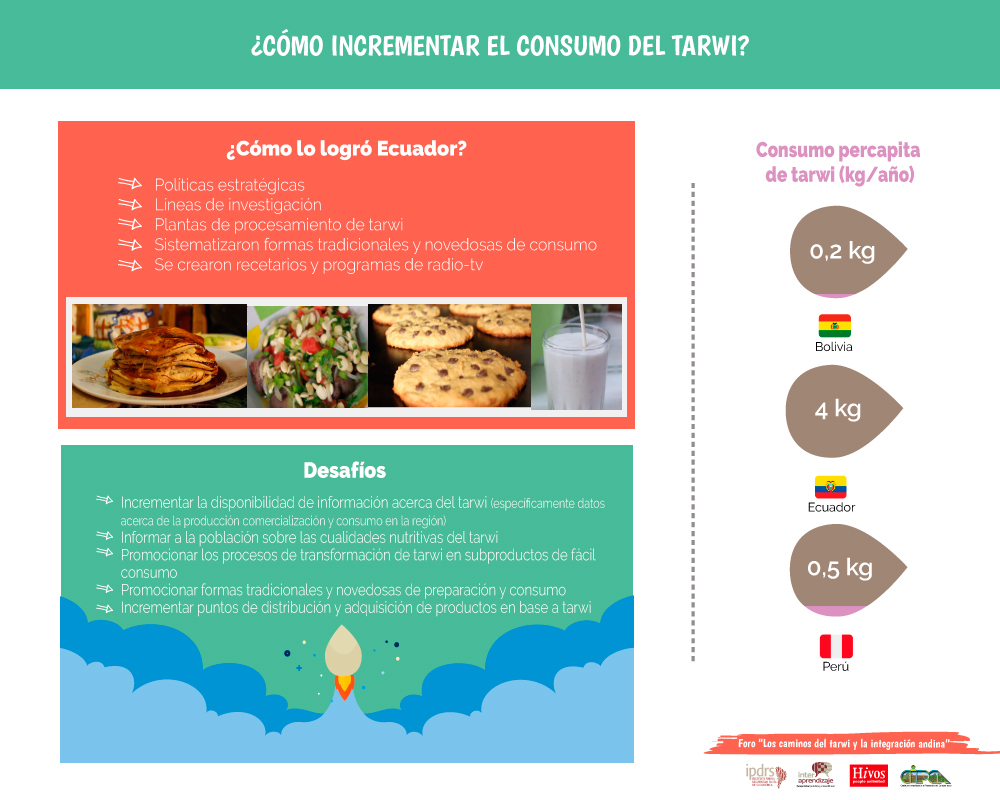 La segunda infografía: ¿Cómo incrementar el consumo de tarwi? retoma un dato importante para entender el consumo per cápita por año del tarwi en los tres países andinos. Para el caso de Bolivia este consumo representa 0,2 kg por año, para el Perú el dato es 0,5 kg y para el Ecuador el consumo es de 4 kg/año.