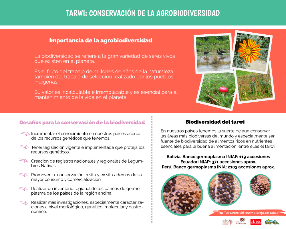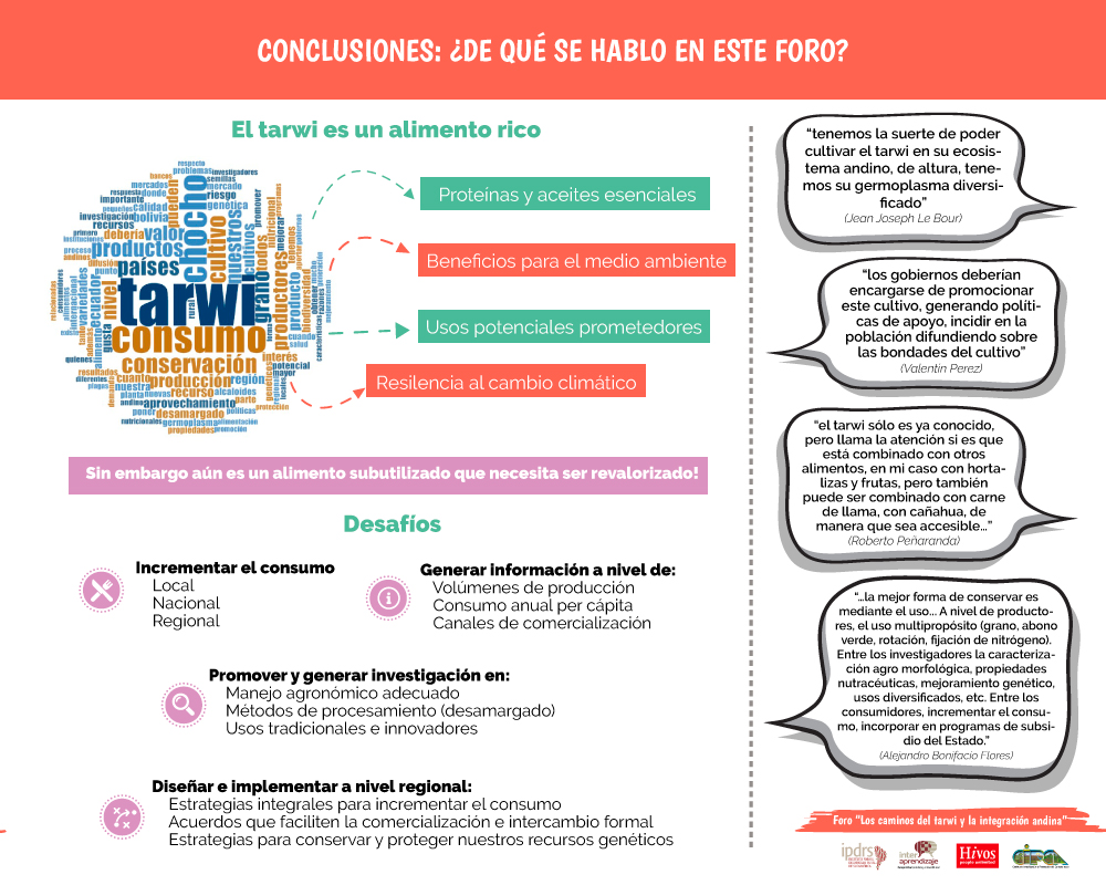 La infografía de Conclusiones: ¿De qué se habló en este foro? Recupera voces que remarcan que “(...) tenemos la suerte de poder cultivar el tarwi en un ecosistema andino de altura y tenemos su germoplasma diversificado”, menciona Jean Joseph Le Bour del Perú. Así, también en la Memoria del foro Lourdes Cuadro del Ecuador afirmaba: