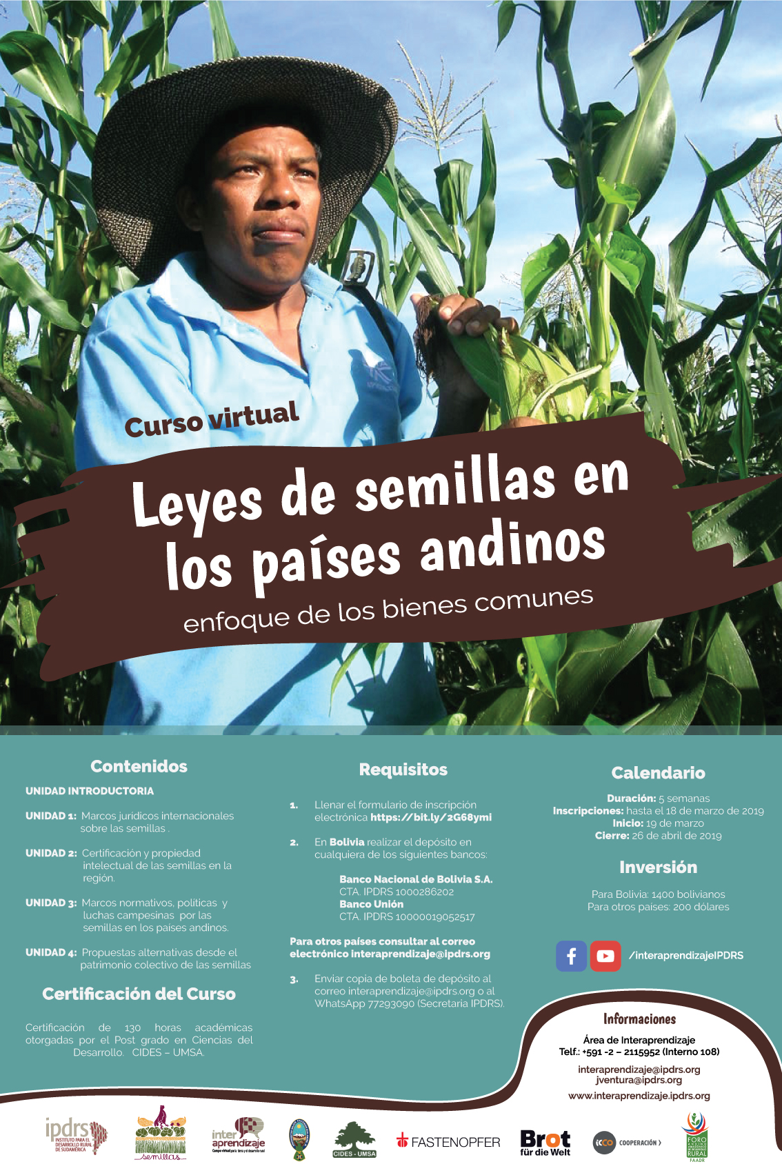 El Instituto para el Desarrollo Rural de Sudamérica IPDRS y el Grupo Semillas en sinergia y coordinación presentan el curso virtual: “Leyes de semillas en los países andinos, enfoque de los bienes comunes”, que tiene como objetivo: