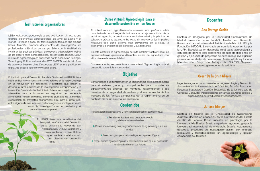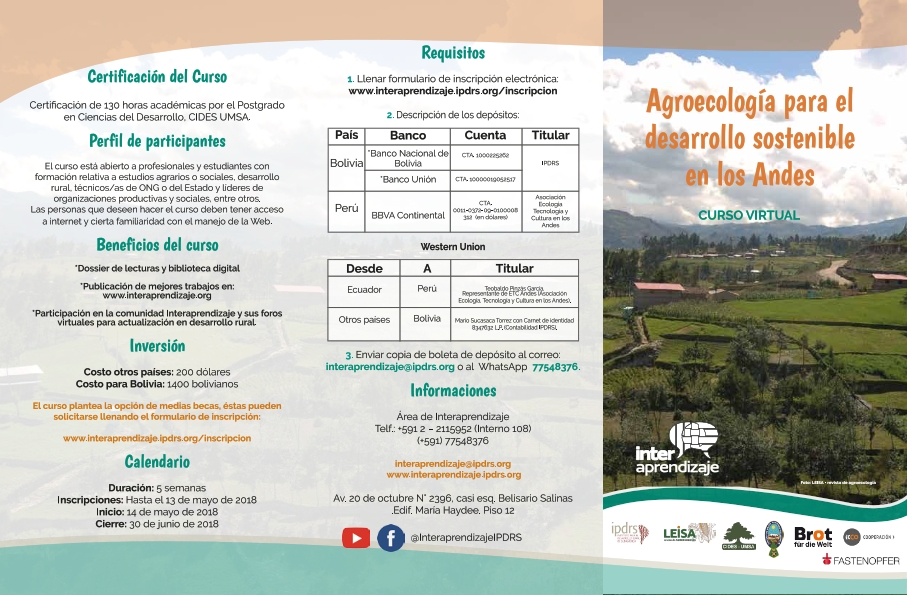 En fecha 14 de mayo, se dio inicio al curso de Agroecología para el desarrollo sostenible en los Andes, un curso organizado por el Instituto para el Desarrollo Rural de Sudamérica (IPDRS) mediante la plataforma de Interaprendizaje y LEISA –revista agroecológica de la Asociación Ecología, Tecnología y Cultura en los Andes (ETC ANDES).