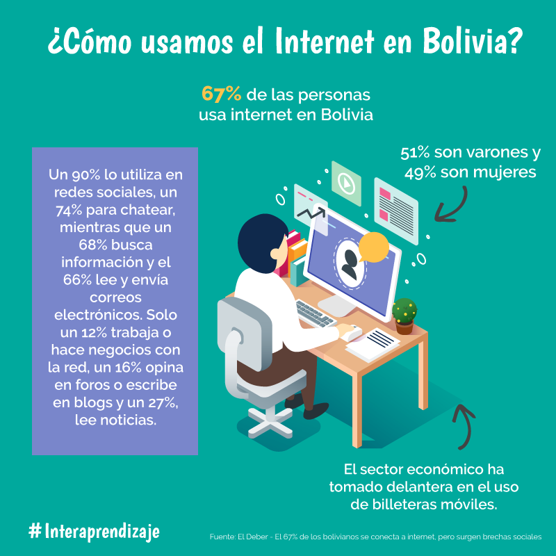 Según estadísticas, en Bolivia el 67% consume Internet, y el mayor uso del tiempo lo utilizamos para las redes sociales.